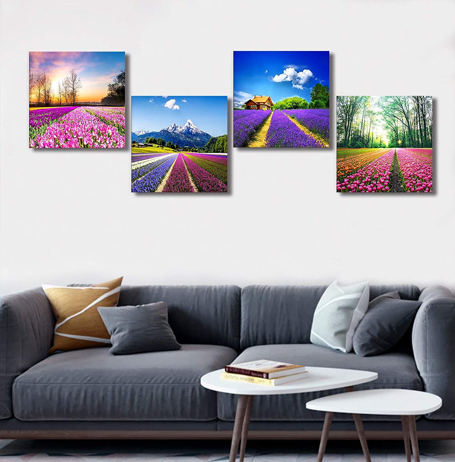 Canvas Prints Tulip Lavender Field Wall Art Colorful Flowers Artworks on Canvas Landscape Painting Framed for Modern Home Decoration