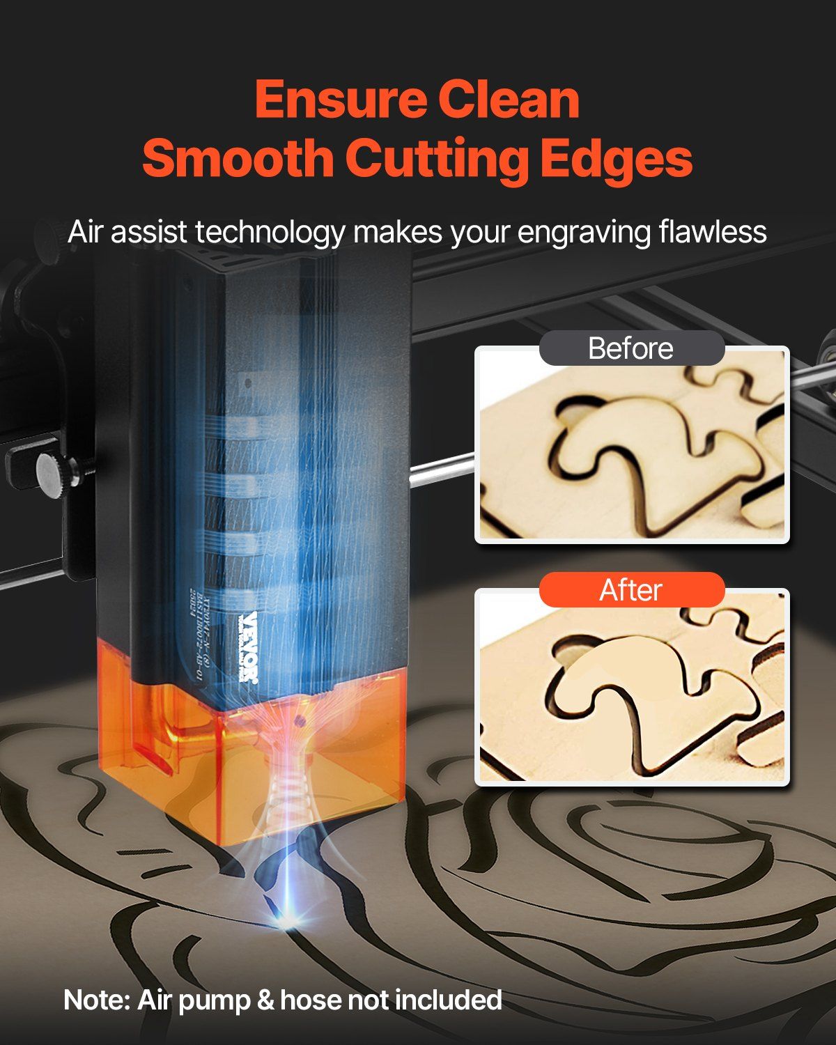 3.Compatible with Air Assist Pump: Enhance cutting performance with air assist compatibility. When paired with an air assist pump, high-speed airflow improves cutting efficiency, avoids dark edges, and delivers a clean, smooth finish. This laser engraver also helps lower surface temperatures during engraving and cutting, resulting in crisp, precise edges (Air assist pump not included)