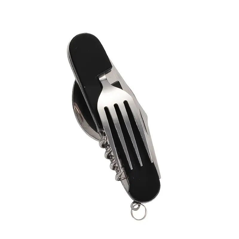 Stainless Steel 6-in-1 Multi-Tool Cutlery Set, Folding Pocket Knife with Fork, Spoon, Can Opener, Corkscrew, and Bottle Opener, Versatile Outdoor Survival Gear, with Varnished Finish for Camping,