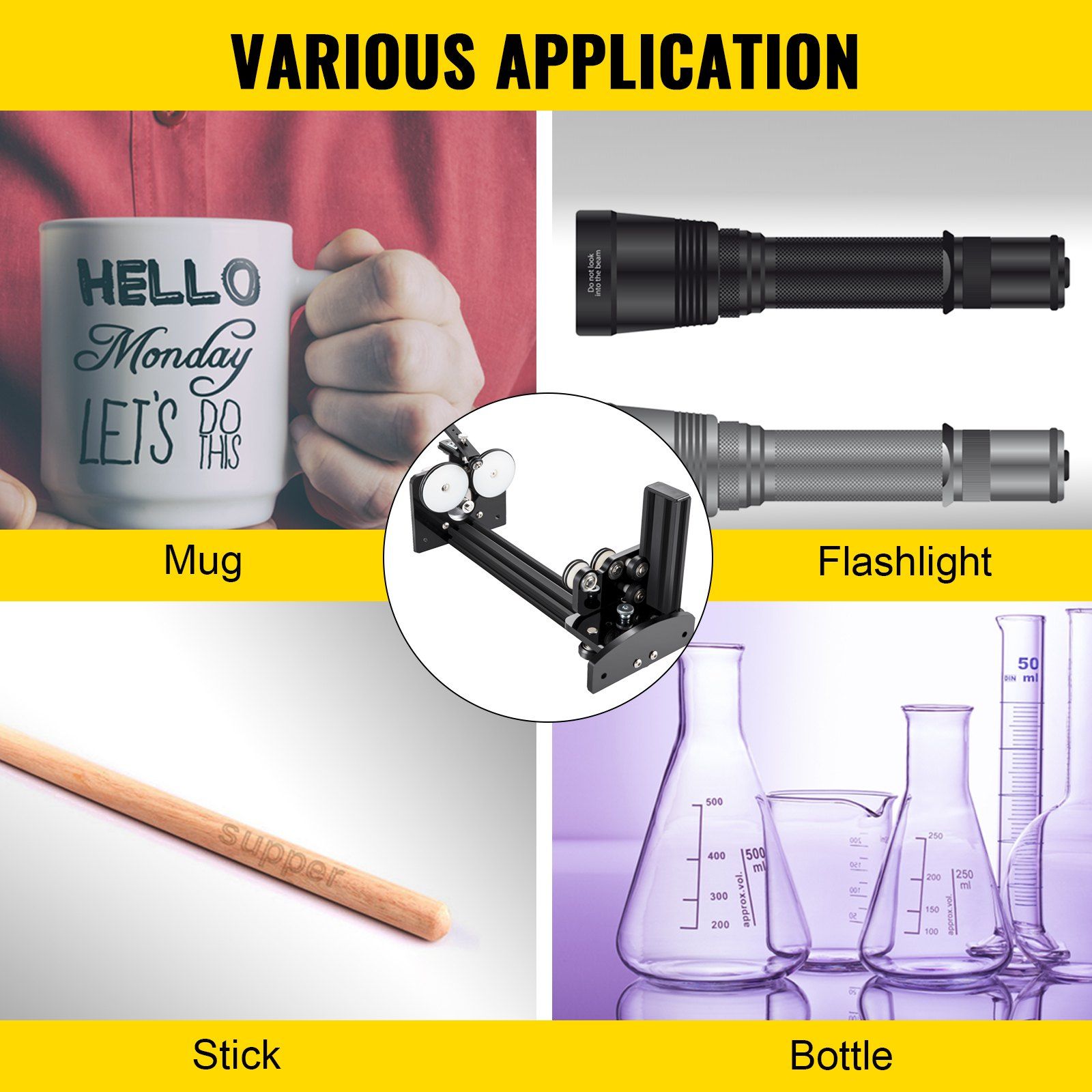 1.[ENGRAVE ON CYLINDRICAL SURFACES] – This rotary axis attachment can work with your laser engraving machine perfectly, allowing you to easily engrave on cylindrical surfaces or round objects as bottles, tubes, pipes, bowls, and more in 360°.